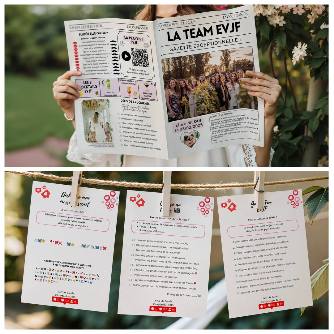 Des gazettes EVJF personnalisées pour surprendre la future mariée, des jeux fun à imprimer pour ambiancer le groupe et des packs complets qui combinent tout pour un EVJF clé en main.