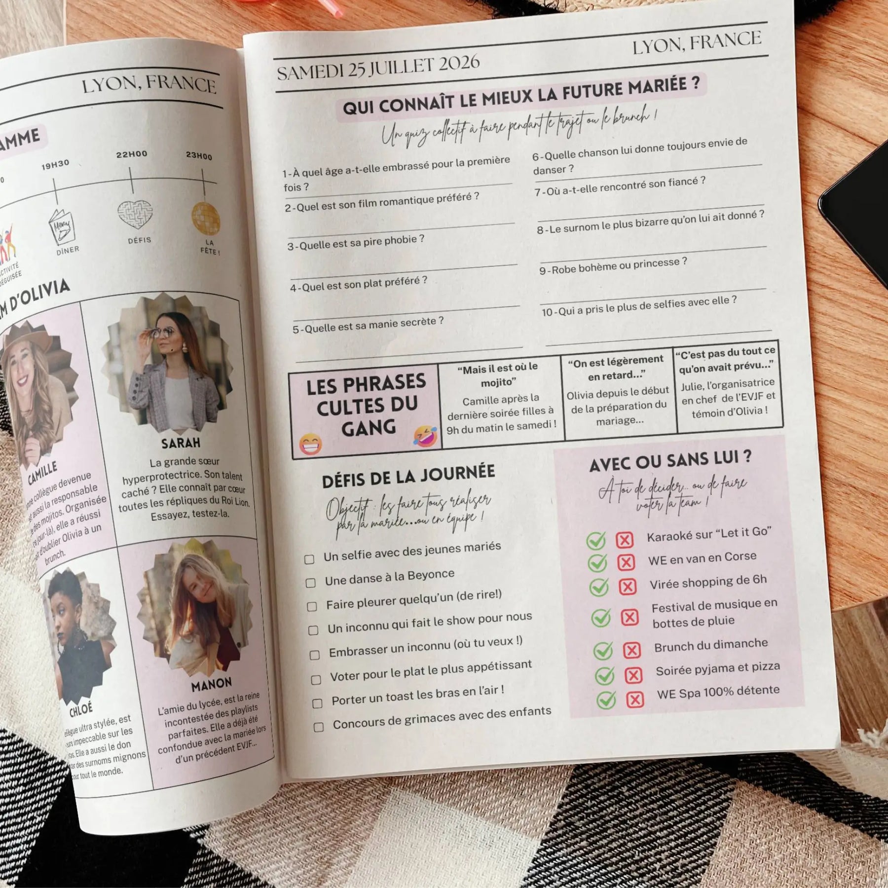 Dans la Gazette EVJF Love Journal, des pages présentent un quiz 'Qui connaît le mieux la future mariée ?', des phrases cultes du gang, une liste de défis à réaliser pendant la journée et la rubrique 'Avec ou sans lui ?' avec des activités validées ou non pour l'enterrement de vie de jeune fille.