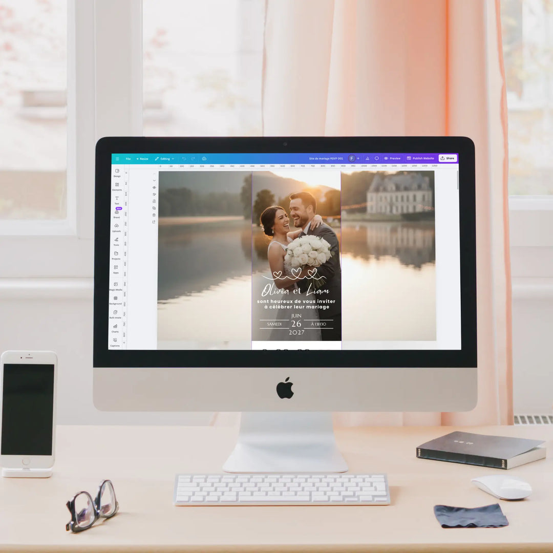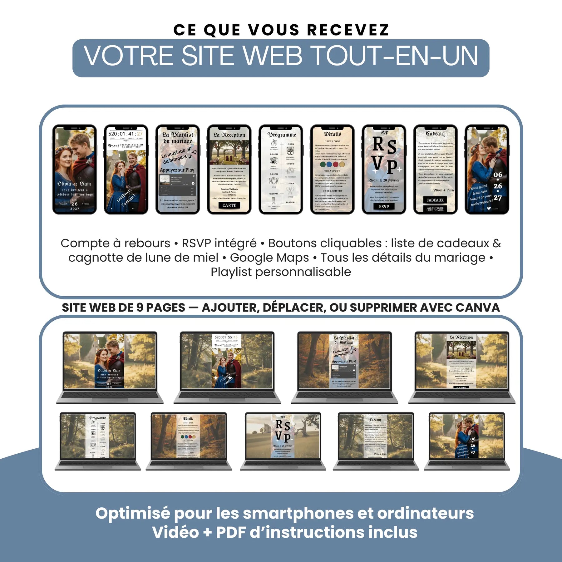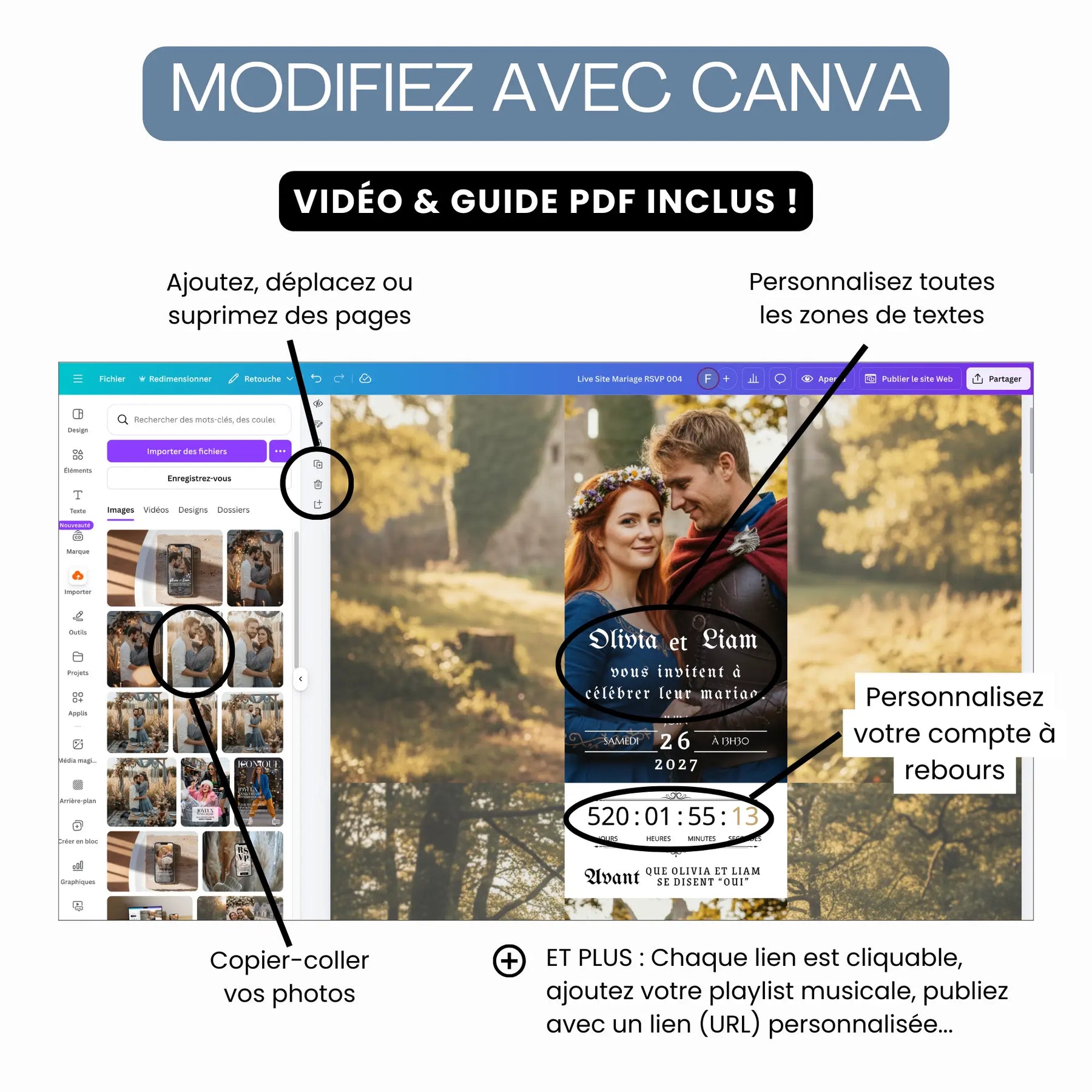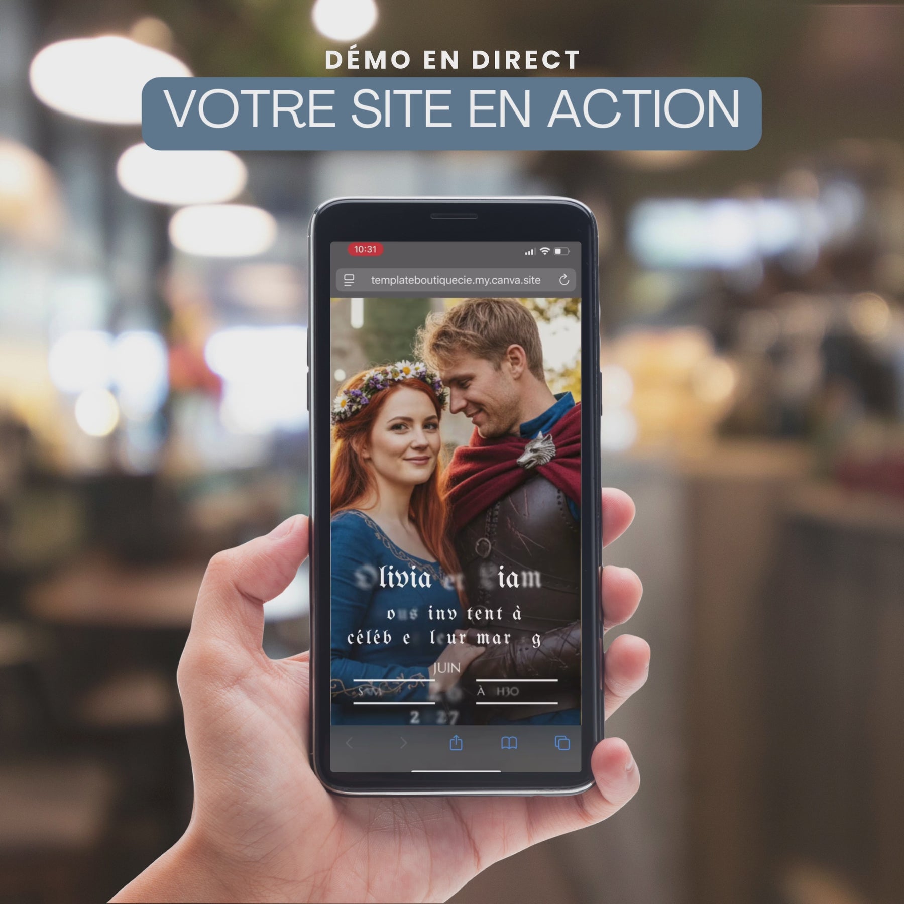 Découvrez notre site d’invitation de mariage médiéval personnalisable avec Canva pour informer vos invités et gérer le RSVP en toute simplicité.