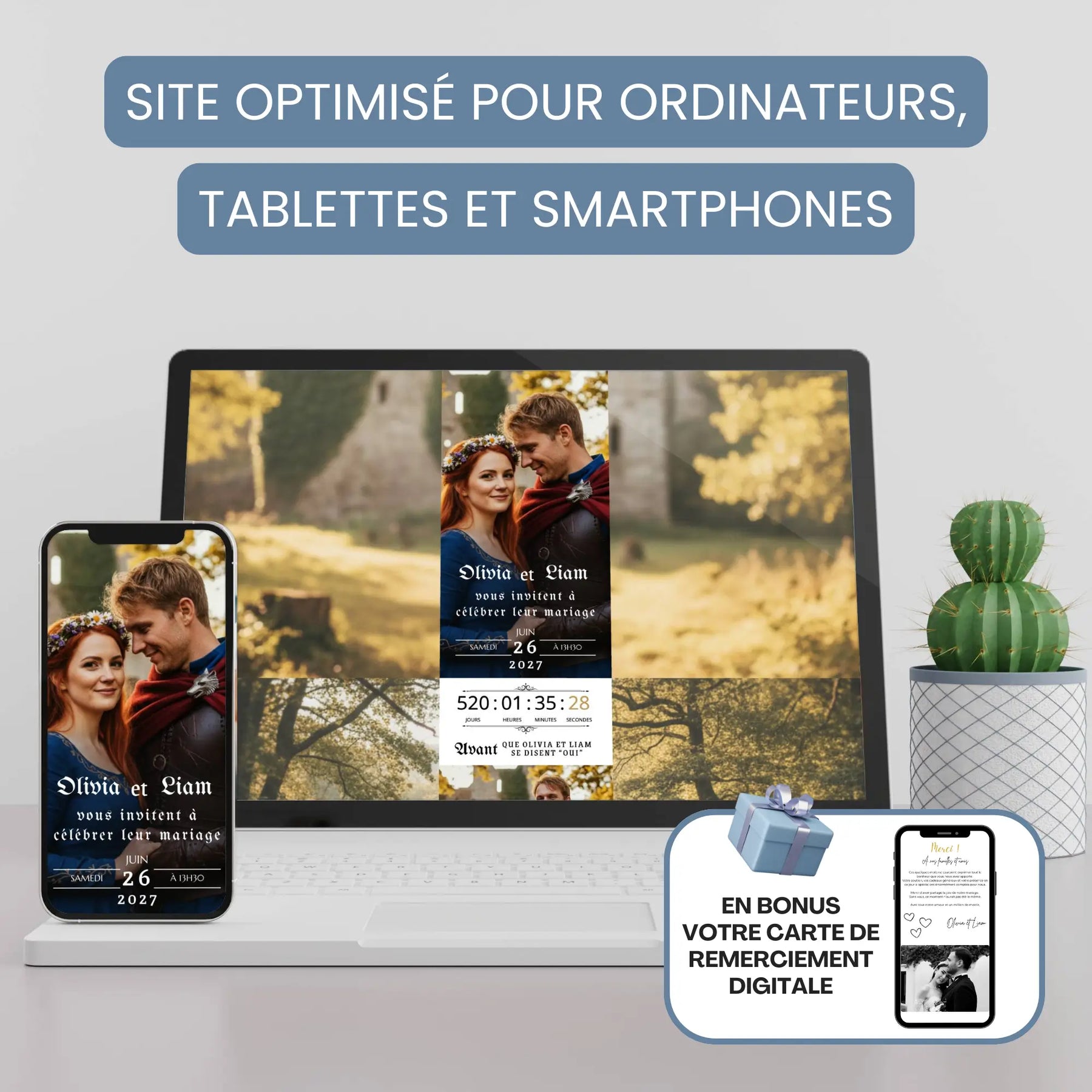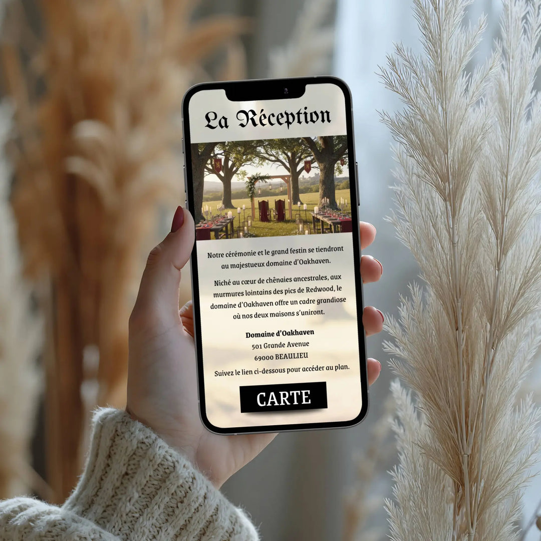 Plongez vos invités dans un univers médiéval et heroic fantasy dès l’annonce de votre mariage grâce à cette invitation digitale, à la fois immersive, pratique et moderne.