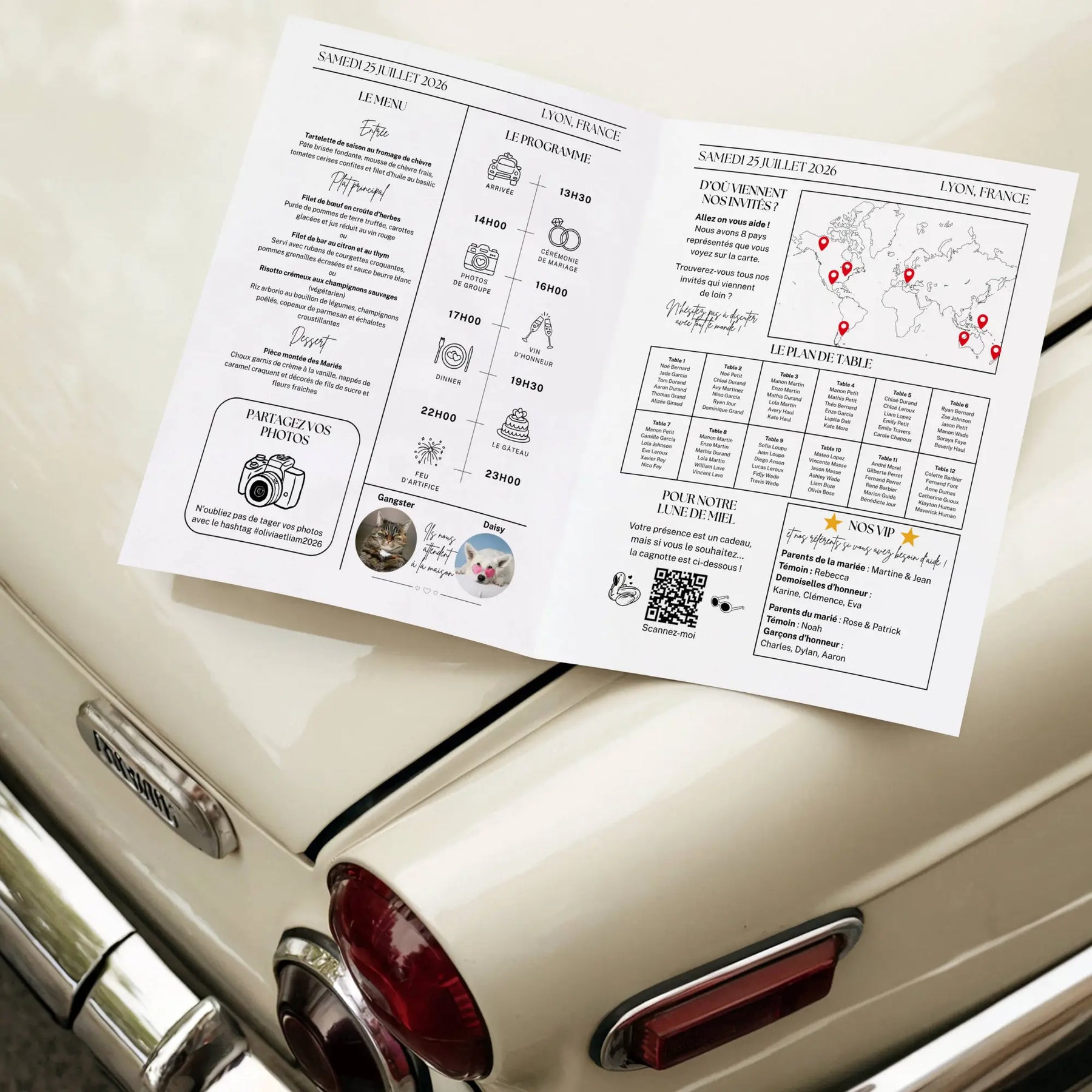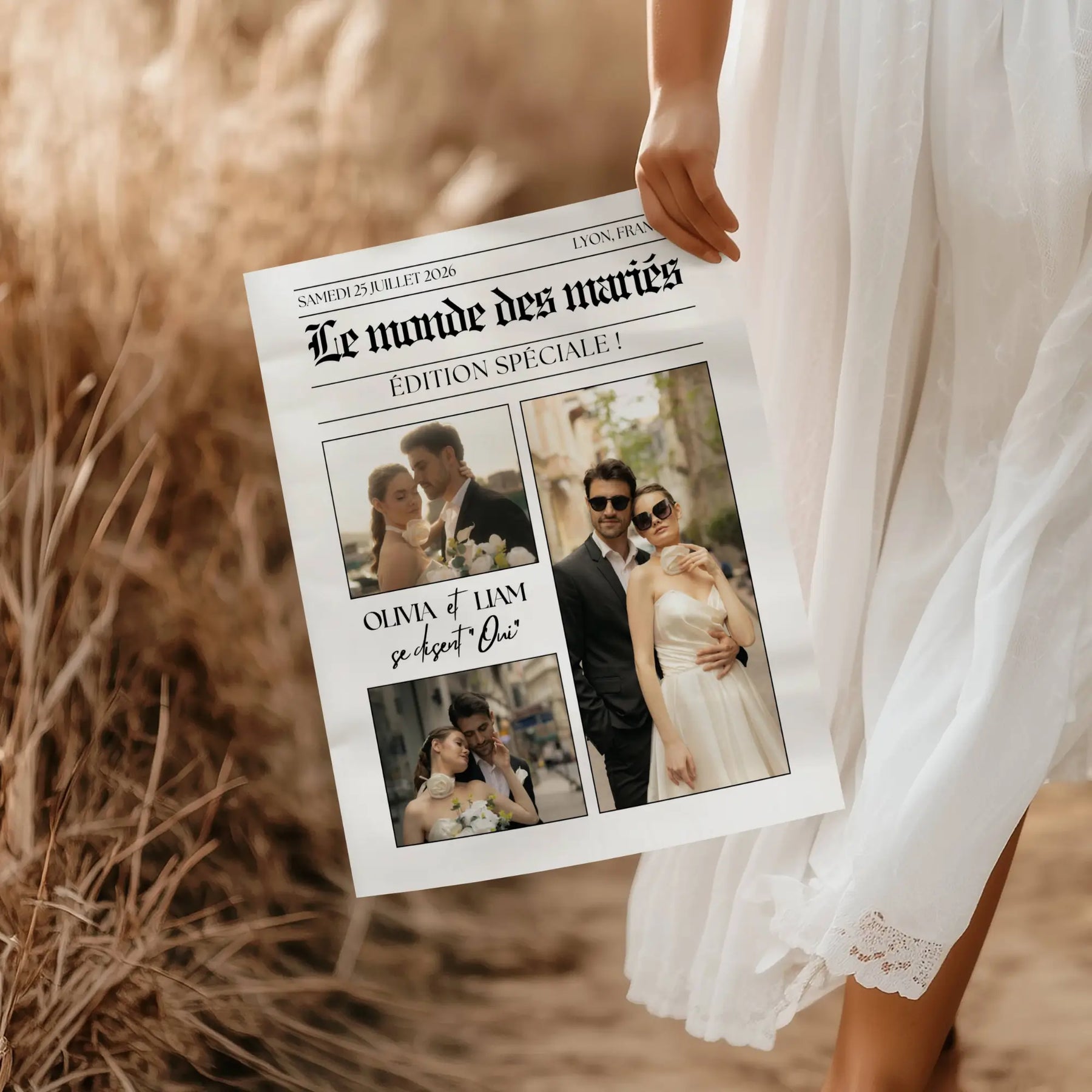 Le format A4 pliable fera l'effet d'un livret plutôt destiné aux jeux alors qu'un format gazette imprimée sur papier journal donnera l'effet d'un véritable journal dédié à votre mariage !