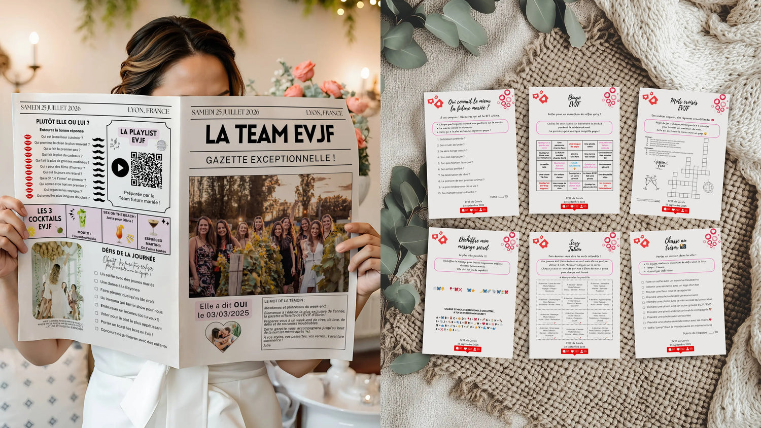 Organisez un EVJF mémorable sans stress : 50 jeux fun + gazette élégante à personnaliser en 30 minutes sur Canva.